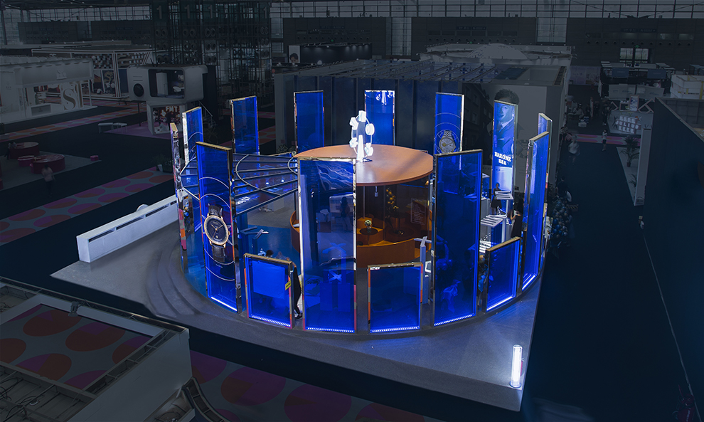 展館進(jìn)出口處4塊5米亞克力高墻分別對(duì)本次展出的3個(gè)明星系列表款進(jìn)行重點(diǎn)展示;展臺(tái)更以腕表中從一到十二的羅馬數(shù)字陳列展示3個(gè)系列的不同表款。