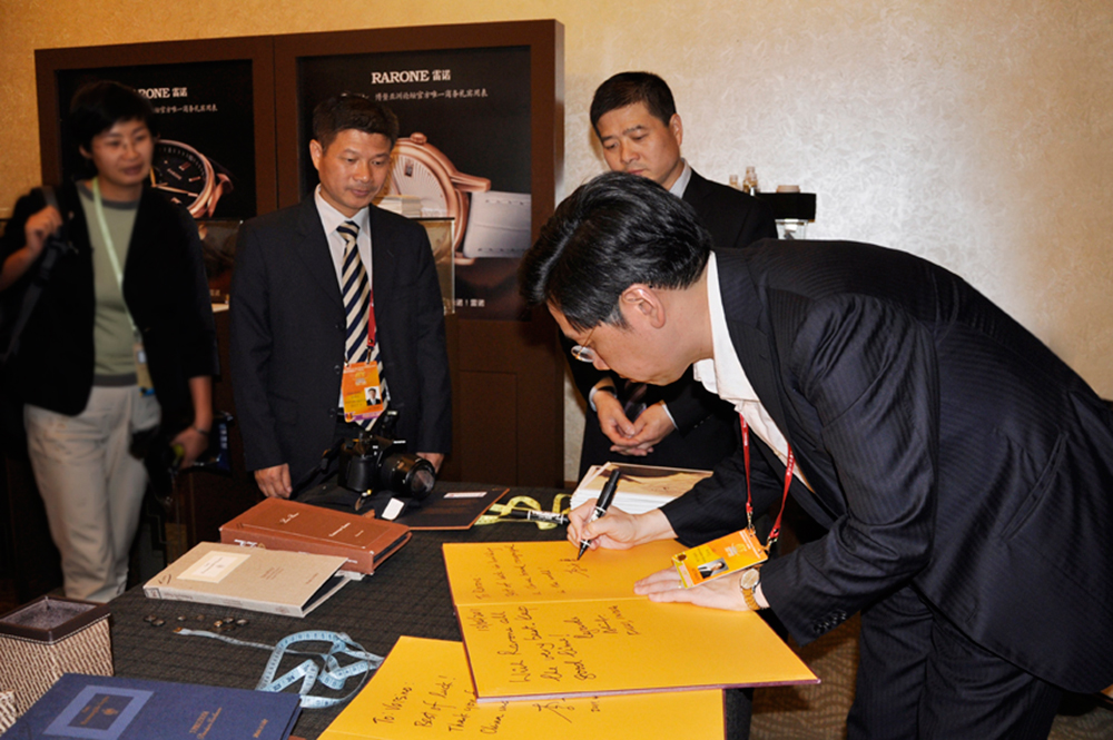 作為“博鰲亞洲論壇的長期合作伙伴•博鰲亞洲論壇官方唯一指定商務禮賓用表”的雷諾表業(yè),董事長詹西洲先生、總經(jīng)理詹江洲先生應邀出席了博鰲亞洲論壇2011年年會,同時,在博鰲論壇主會場設置的雷諾品牌形象展示區(qū),以“新一代商務經(jīng)典男表”品牌定位,獲得了參會嘉賓的一致好評。